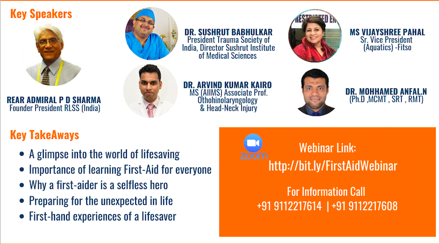 To mark the 20th year of the World First Aid day on 12 September 2020 and raise first aid awareness among the masses, the Rashtriya Life Saving Society (India) is organising a Free Webinar from 4 pm to 5:30 pm, when distinguished speakers shall speak on the importance and benefits of learning First Aid. We are launching ‘Surakshit Bharat’ campaign in line with ‘Swatch & Swasth Bharat’ campaigns, now under way in the country.